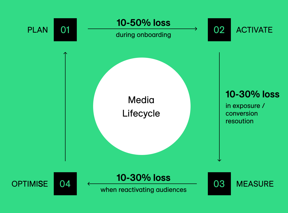For example, without a consistent, durable identifier, brands can lose 10-50% of their audience during onboarding, another 10-30% during measurement, and another 10-30% during optimisation, creating a broken loop that makes accurate attribution nearly impossible.